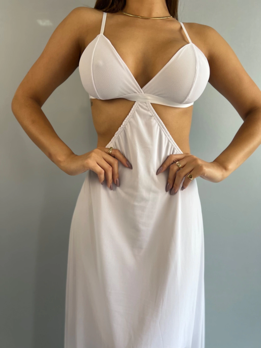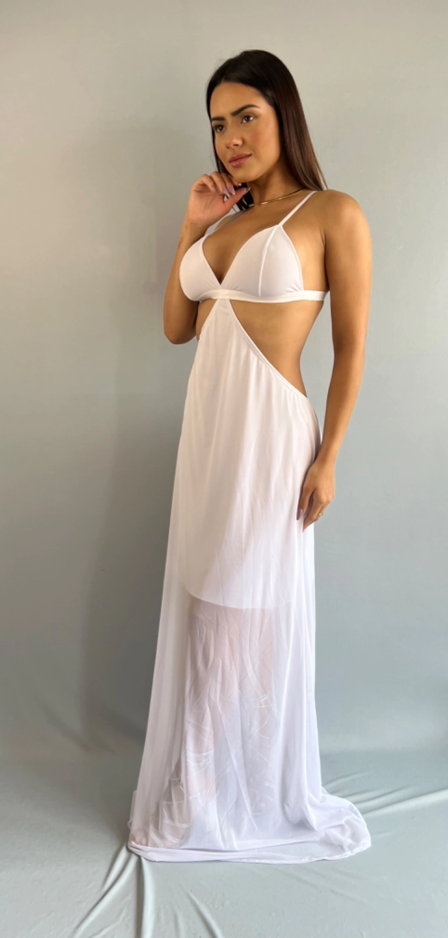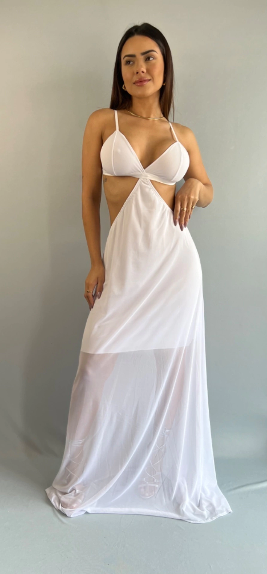 Produto: Vestido Longo, saia em tule com forro. Alcinha fina, costas aberta.